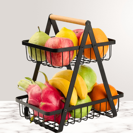 Fruit Basket, 2 Tiers, Wooden Handle, Easy to Install, Metal, Black